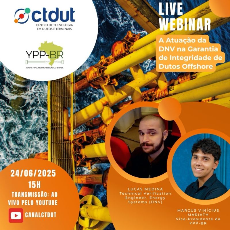 Através da parceria CTDUT – Centro de Tecnologia em Dutos e Terminais / Pipelines and Terminals Technology Center, DNV e Young Pipeline Professionals Brazil – YPP Brazil, realizaremos, no dia 24/06/2025, uma live sobre Garantia de Integridade de Dutos Offshore.